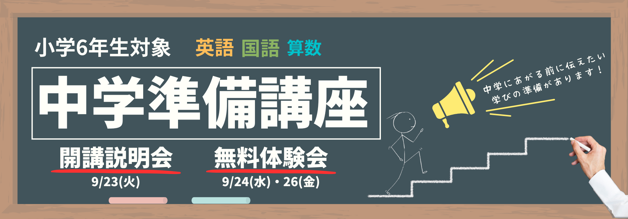 中学準備講座開講に伴い、下記の日程で説明会を実施いたします。ぜひお誘いあわせの上、お越しください。お申し込みは、下記のフォームより承ります。