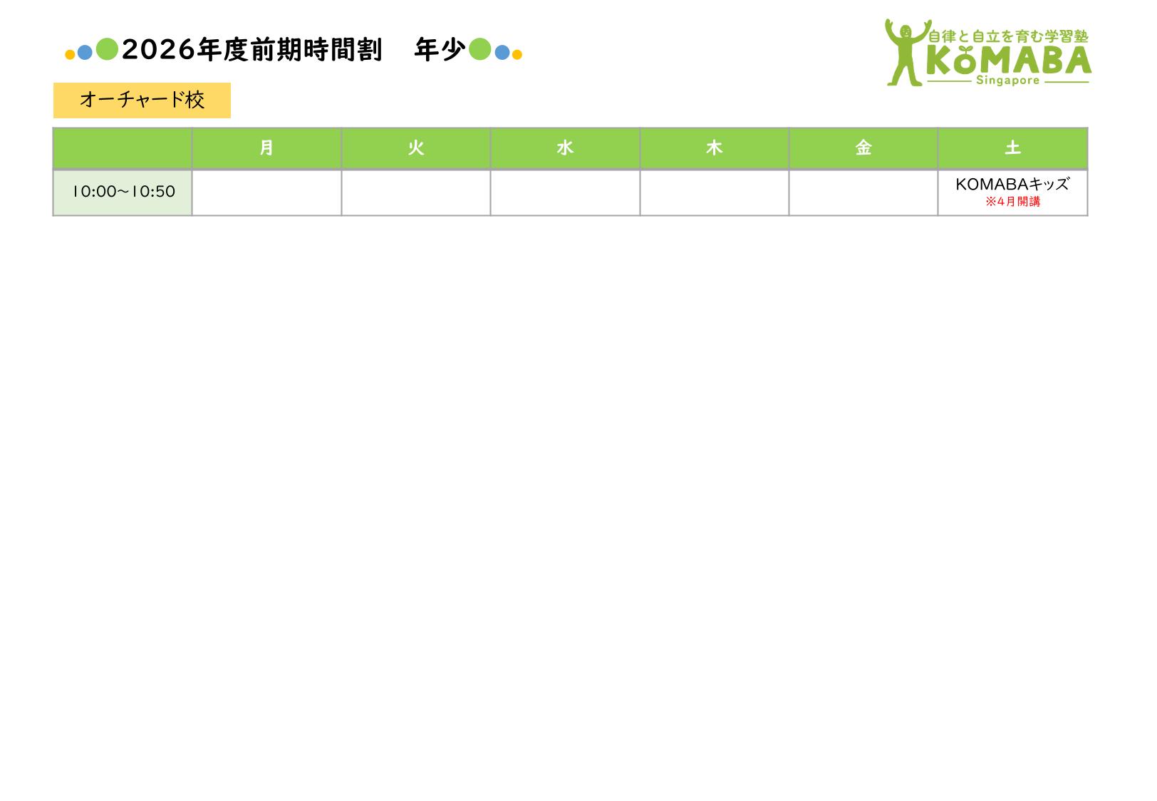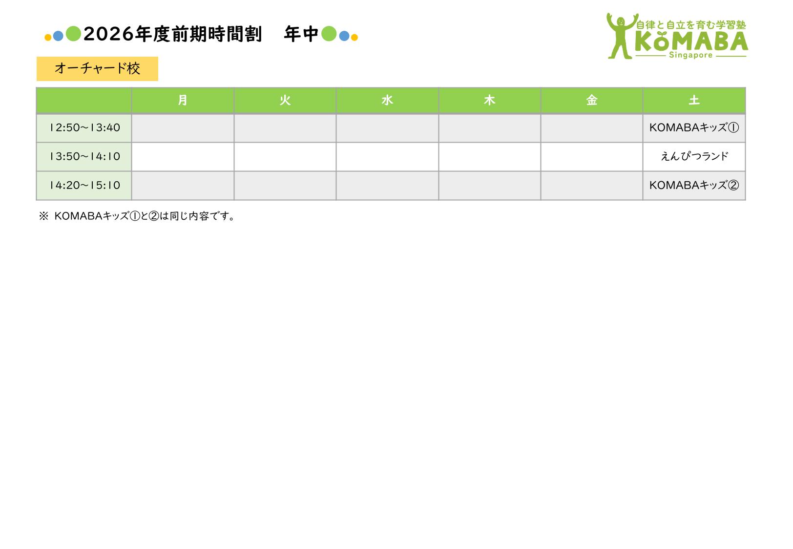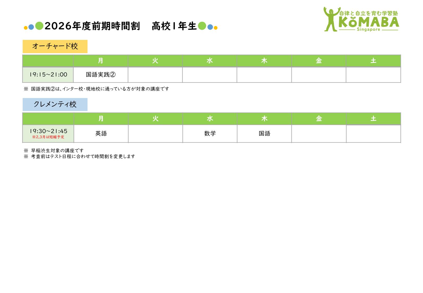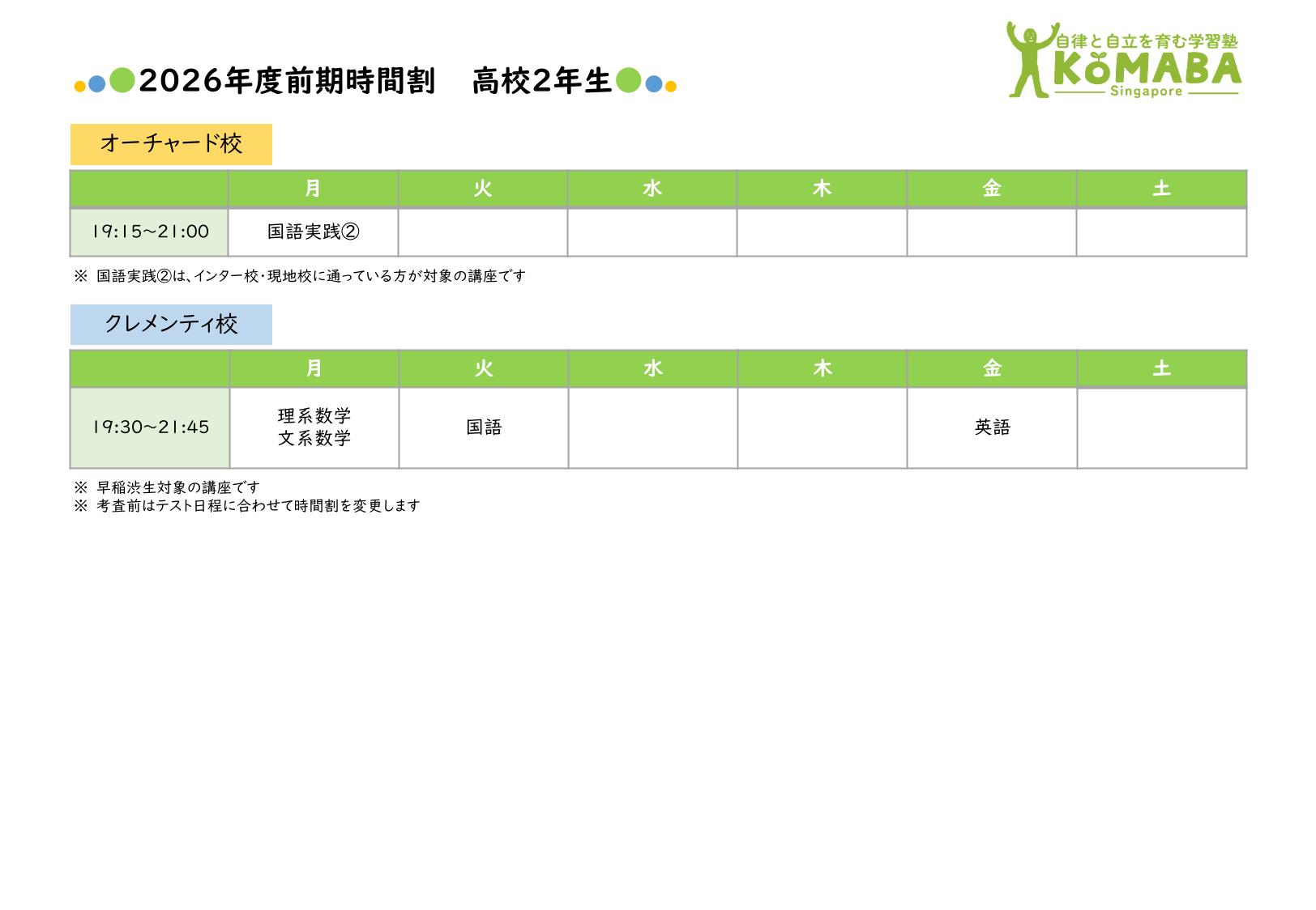 2026年度前期(2026年2月~2026年7月)の時間割です。 2026年1月中の時間割は2025年度後期の時間割をご覧ください。